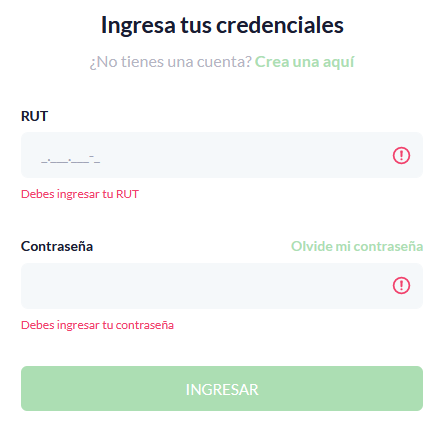 Datos no ingresados Ocurre cuando no se ingresan el RUT y/o la contraseña, recuerda que debes ingresar tus credenciales de acceso que fueron creadas en el formulario de registro. Si deseas registrarte y no sabes como hacerlo, haz clic sobre este texto.