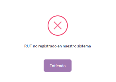 RUT no registrado Ocurre cuando el RUT ingresado no está registrado en nuestro sistema. En este caso te recomendamos verificar que tu RUT esté bien ingresado, recuerda ingresar solo números, el sistema formateara el RUT de manera automática, por otro lado, evita copiar y pegar tu RUT en la casilla correspondiente.