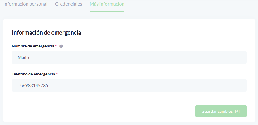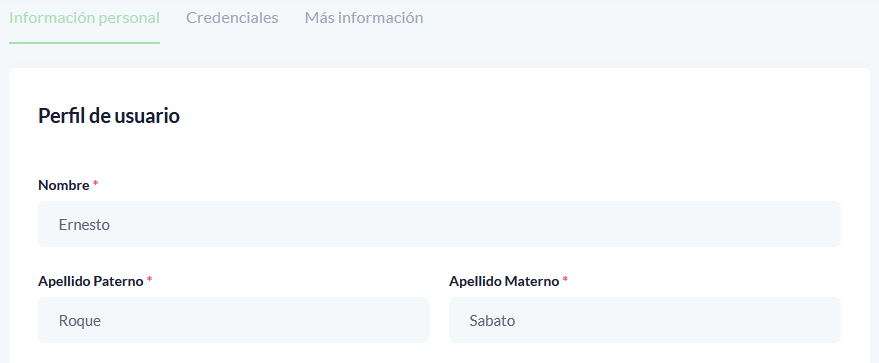 Estas pestañas (Información personal, Credecniales y Más información) te permiten ver/editar la informacion respectiva a tu perfil, es importante mencionar que los cambios ingresados en esta pestaña, no seran aplicados hasta que presiones el botón . Te recordamos que esta acción es validada por el sistema, si deseas conocer dichas validaciones haz clic sobre este texto.