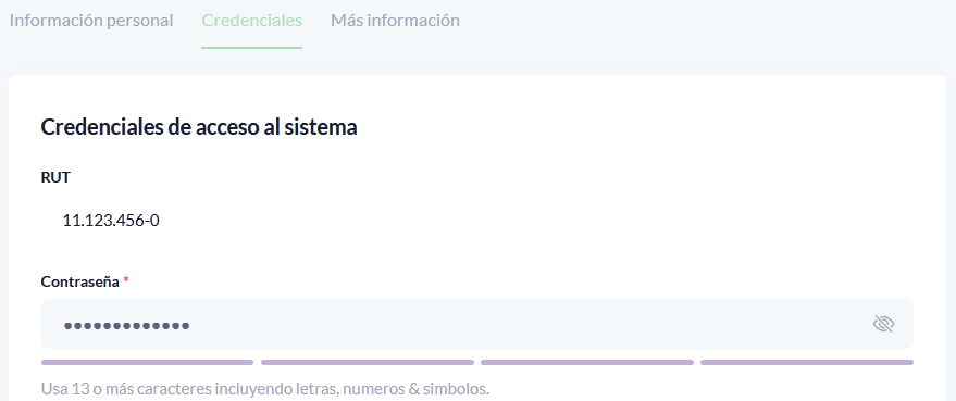Estas pestañas (Información personal, Credecniales y Más información) te permiten ver/editar la informacion respectiva a tu perfil, es importante mencionar que los cambios ingresados en esta pestaña, no seran aplicados hasta que presiones el botón . Te recordamos que esta acción es validada por el sistema, si deseas conocer dichas validaciones haz clic sobre este texto.